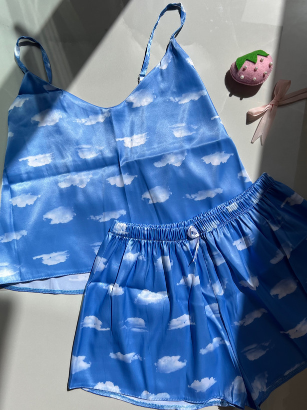 ست تاپ شلوارک زنانه لباس خواب ساتن راحتی ابر آبی کد ۴۲