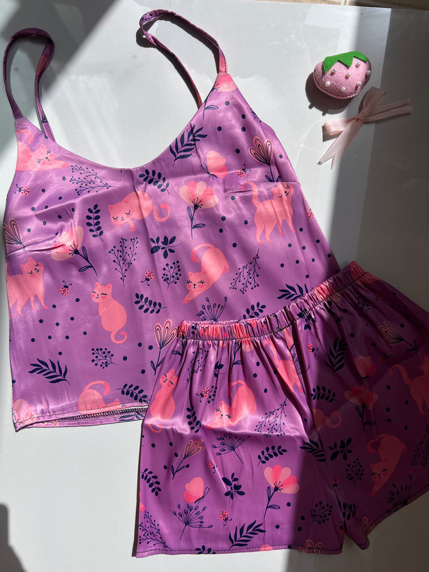 تاپ شلوارک لباس خواب زنانه ساتن راحتی گربه کد ۴۶