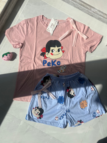 ست سه تیکه تیشرت شلوار شورتک زنانه وارداتی نخ پنبه لاکراناموجود
